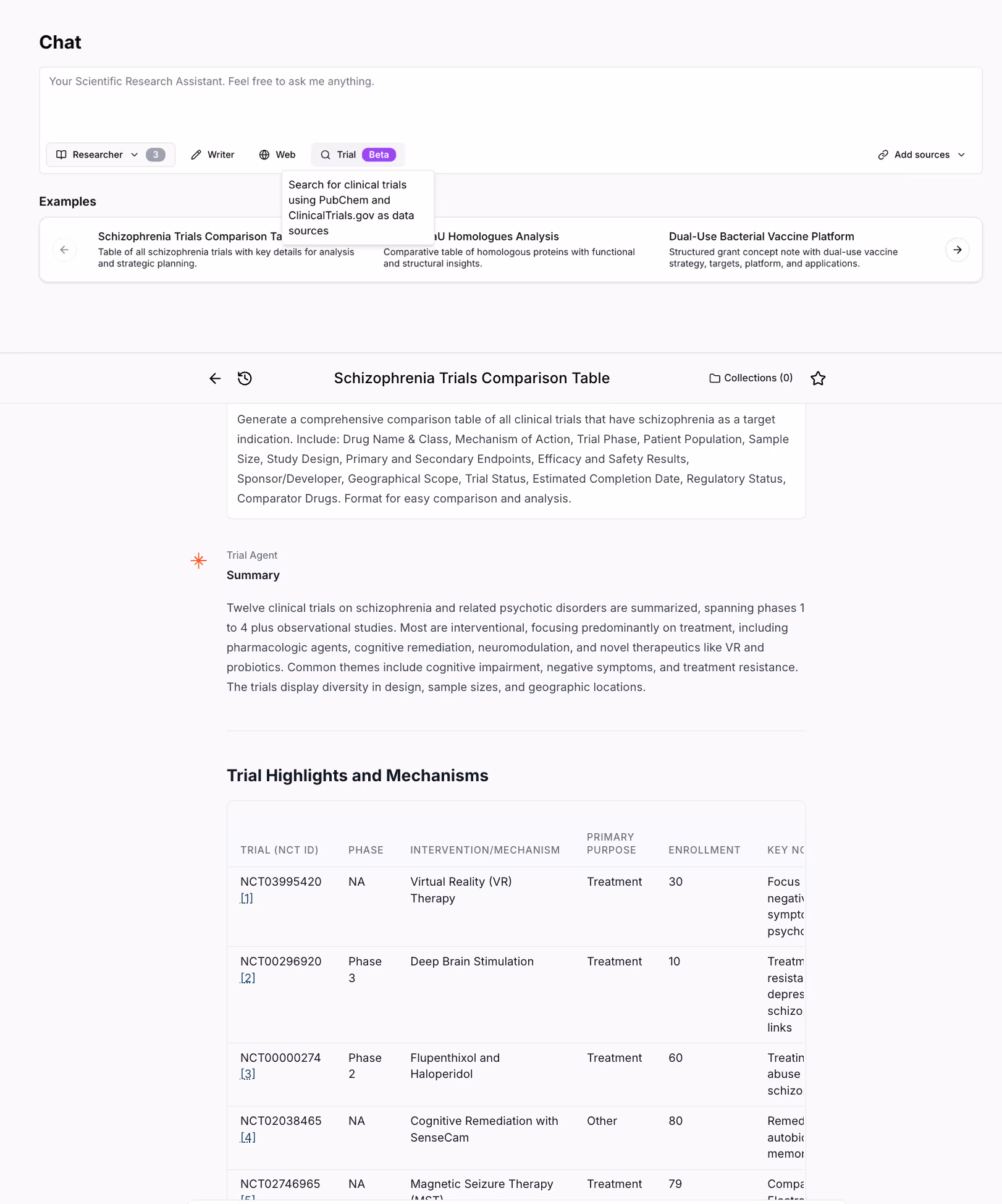Top: The Amass chat interface, where the user can pose a query and select sources. Here, the Trial Agent is chosen, which queries ClinicalTrials.gov and expands the search with molecule synonyms from PubChem to capture all relevant results. Bottom: The user requests a comprehensive table of schizophrenia trials for comparative analysis. The agent returns a summary and table with trial phases, intervention mechanisms, enrollment numbers, key notes, among other details. This organization allows the user to efficiently review and compare 12 schizophrenia trials in one place, rather than scrolling through lengthy individual trial pages.